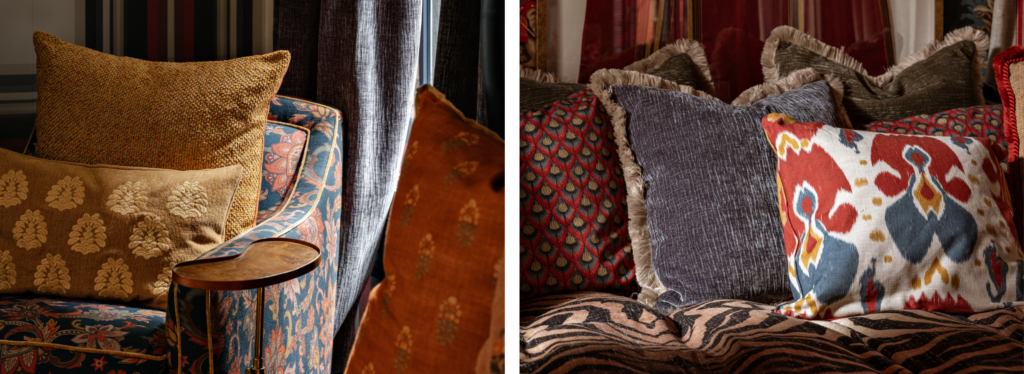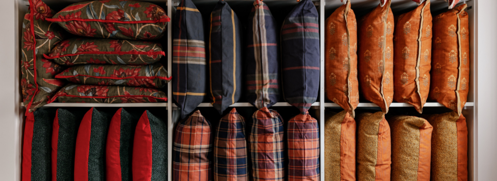 As texturas também são protagonistas. Tecidos encorpados, superfícies macias, tramas aparentes e acabamentos especiais criam camadas visuais e sensoriais que convidam ao toque e conforto. Uma boa composição de almofadas não se vê apenas, ela se sente.